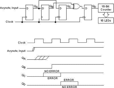 If a metastable event in the first flip-flop increases the settling time on QA so much that QC misses the change, but QB still captures it on the next rising clock edge, this error can be detected by feeding the XOR of QB and QC into a falling-edge triggered flip-flop. Its output (QD) is normally Low, but goes High for one clock period each time the asynchronous input transition caused such a metastable delay in QA. The frequency of metastable events can be observed with a 16-bit counter driven by QD.