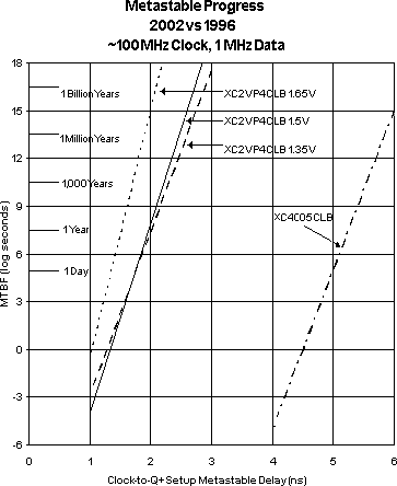 Xilinx Applications began measuring and publishing metastable results as early as 1988. The earliest data was published in 1989, and was expanded in 1997 to cover newer devices. To illustrate the improvement in the Virtex-II Pro flip-flop, Fig 3 combines the new results with the 1997 results, all normalized to 1 MHz asynchronous data and 100 MHz clock rate. (Recalculating MTBF for lower data and clock frequencies increases MTBF, but does not affect the slope on the logarithmic scale. It effectively moves the lines to the left to compensate for the 150 times smaller product of the two frequencies, causing an MTBF that is 150 times longer.)