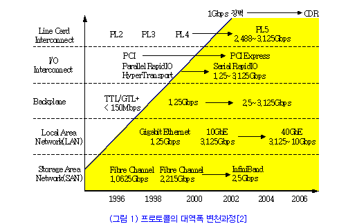 FPGA´Â ¾Õ¼ ¾ð±ÞÇÑ ¿ÜÇüÀûÀÎ ¼º´É Çâ»óÀº ¹°·Ð IP Äھ ³»ÀåÇÔÀ¸·Î½á ±â´É¸é¿¡¼µµ °æÀï·ÂÀ» °®Ãß°Ô µÇ¾ú´Ù. Altera¿¡¼´Â PLD ¾÷°è ÃÖÃÊ·Î Excalibur¶õ µð¹ÙÀ̽º·Î ARM ÇÁ·Î¼¼¼¸¦ FPGA¿¡ ³»ÀåÇÏ¿´À¸¸ç, Xilinx¿¡¼´Â PowerPC 405 ÇÁ·Î¼¼¼¸¦ Virtex-II ¾ÆÅ°ÅØÃ³¿¡ ³»ÀåÇÏ¿´´Ù. ½Ã½ºÅÛ ¿¬°á¿¡ »ç¿ëµÇ´Â Àü¼Û ÇÁ·ÎÅäÄÝÀÌ °í¼Ó, Á÷·ÄÈ µÊ¿¡ µû¶ó °í¼Ó Á÷·Ä ¹ö½º¿ë Æ®·£½Ã¹ö »ç¿ëÀÌ ÀϹÝÈ µÇ¾ú´Ù. (±×¸² 1)¿¡¼ º¸µíÀÌ ¹éÇ÷£, I/O ¿¬°á, ¶óÀÎÄ«µå ¿¬°á, LAN, SAN¿¡¼ µ¿ÀÛ¼Óµµ°¡ ±â°¡ºñÆ®·Î ³Ñ¾î°¡¸é¼ FPGA¿¡¼ À̸¦ Áö¿øÇϱâ À§ÇØ CDR (clock data recovery) ±â´ÉÀ» Æ÷ÇÔÇÏ´Â ±â°¡ºñÆ® Æ®·£½Ã¹ö¸¦ ³»ÀåÇÏ´Â Á¦Ç°ÀÌ Ãâ½ÃµÇ±â ½ÃÀÛÇß´Ù. ÀÌ·¸°Ô °í¼Ó Á÷·Ä¹ö½º ÇÁ·ÎÅäÄÝÀ» Áö¿øÇÏ´Â Æ®·£½Ã¹ö¸¦ ³»ÀåÇÔÀ¸·Î½á Ĩ ¹ÛÀ¸·Î ÀÎÅÍÆäÀ̽º µÇ´ø ¿ÜÀå µ¥ÀÌÅÍ Á÷º´·Äȱâ(SerDes)1) ¸¦ ¿Â ĨÀ¸·Î ´ëüÇÏ°Ô µÇ¾ú´Ù. ¼Ò½º ½ÌÅ©·Î³Ê½º Ŭ·Ï ½ÅÈ£ ¶ÇÇÑ µ¿½Ã¿¡ Áö¿øÇÏ¿©, ¹éÇ÷£ µðÀÚÀÎÀÇ ÇÙ½É ÀÎÅÍÆäÀ̽º·Î ±× À§Ä¡¸¦ ÀÚ¸®Àâ¾Æ°¡°í ÀÖ´Ù.