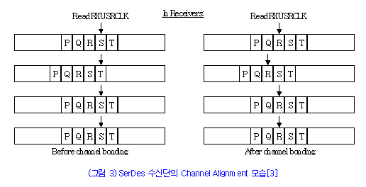 ¼ö½ÅºÎ¿¡¼´Â ÀԷµǴ °í¼Ó Â÷µ¿ µ¥ÀÌÅÍ´Â CDR´Ü¿¡¼ Ŭ·Ïº¹±¸(Clock Recovery)¸¦ ¸ÕÀú ¼öÇàÇÑ´Ù. µ¥ÀÌÅÍ¿¡¼ º¹¿øµÈ Ŭ·ÏÀÇ Á֯ļö¿Í ÀÔ·Â ±âÁØÁ֯ļö´Â ¼Ò½º°¡ ´Ù¸£±â ¶§¹®¿¡ ¹Ì¹¦ÇÑ Á֯ļö Â÷À̰¡ ¹ß»ýÇÑ´Ù. µû¶ó¼ À̸¦ ¿ÏÃæÇØ ÁÖ´Â Elastic Buffer°¡ Á¸ÀçÇϸç SkipÀ̳ª Idle ½Éº¼ µîÀ» »ç¿ëÇÏ¿© µÎ Á֯ļöÀÇ Â÷À̸¦ º¸»óÇØ ÁØ´Ù. ƯÈ÷ ¼ö½Å´Ü¿¡¼´Â ÀԷµǴ ½Éº¼ Áß Comma °°Àº Áß¿äÇÑ ½Éº¼µéÀ» °¨ÁöÇÒ ¼ö ÀÖ´Â ÆÐÅϰ¨Áö(Pattern detector) ±â´É°ú ºñÆ® ½ºÆ®¸²À» ¹ÙÀÌÆ® ´ÜÀ§·Î Á¤·ÄÇÏ´Â Word Aligner µîÀÌ Á¸ÀçÇÑ´Ù. XAUI, InfiniBand, PCI-Expresss µî °°ÀÌ ´ÙÁß Ã¤³Î(·¹ÀÎ)À» »ç¿ëÇÏ´Â ¾ÖÇø®ÄÉÀ̼ǿ¡¼ Channel Alignment(¶Ç´Â Bonding) ºí·ÏÀº Àü¼Û¼±·ÎÀÇ ÆÐÅÏ ±æÀÌÀÇ Â÷ÀÌ µîÀ¸·Î ÀÎÇØ µ¿±â°¡ µÇÁö ¾ÊÀº ´ÙÁß ·¹Àΰ£ÀÇ ½Ã°£ÀûÀÎ Â÷À̸¦ º¸»óÇØ ÁÖ´Â ¿ªÇÒÀ» ¼öÇàÇÑ´Ù. (±×¸² 3)Àº Channel Alignment¸¦ ÅëÇÏ¿© ´ÙÁß Ã¤³Î°£ÀÇ µ¿±â¸¦ ¸Â Ãß´Â ¸ð½ÀÀ» º¸¿© ÁÖ°í ÀÖ´Ù.