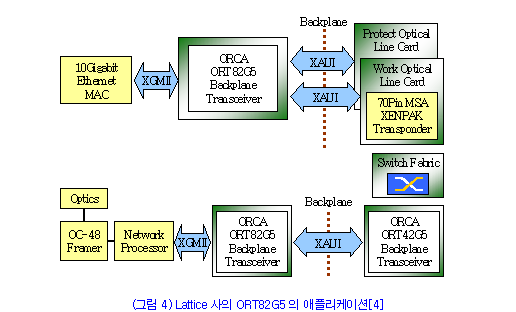 ORT82G5 Á¦Ç°ÀÇ ¾ÖÇø®ÄÉÀ̼ÇÀ¸·Î´Â ÁÖ·Î 10GbE¿¡ Ÿ°ÙÆÃ µÇ¾î ÀÖ´Ù. (±×¸² 4)´Â ORT82G5ÀÇ 3.125Gbps µ¥ÀÌÅÍ 8ä³ÎÀ» »ç¿ëÇÏ¿© µÎ XAUI ¹éÇ÷£À» ±¸µ¿ÇÏ´Â ¹æ¹ý°ú ORT42G5ÀÇ 3.125Gbps µ¥ÀÌÅÍ 4ä³Î »ç¿ëÇÏ¿© ÇÑ XAUI ¹éÇ÷£ ÀÎÅÍÆäÀ̽º¸¦ ±¸ÇöÇÑ ¸ð½ÀÀ» ³ªÅ¸³½´Ù. ±×¸²°ú °°ÀÌ 10GbE MAC ȤÀº Network Processor¿Í XGMII ÀÎÅÍÆäÀ̽º¸¦ XAUI ¹éÇ÷£À¸·Î ºê¸®ÁöÇÒ ¶§ ÀÌ»óÀûÀÎ FPGA ¿ªÇÒÀ» ¼öÇàÇÒ ¼ö ÀÖ´Ù.