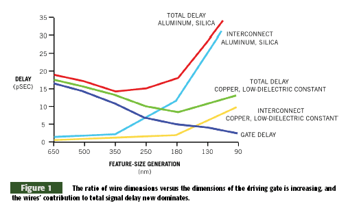 Things changed with the advent of 180nm processes: Wire delays became more relevant than gate delays. Gates are now smaller than most of the interconnecting wires, so propagation delays in the wire are significantly greater than gate delays. In addition, the calculation of the delay that wiring causes must take into account second- and third-order parameters. For example, crosstalk depends not only on the physical characteristics of the wire, but also on the placement and behavior of neighboring wires. You cannot, therefore, obtain a satisfactory estimate of wire delay without knowing something about the topology of the final product. Designers are finding that circuits that must operate at high frequency or with low power are the most susceptible to crosstalk, even on a pc board. The reason for this phenomenon is that, especially in IC design, the ratio of wire dimensions versus the dimensions of the driving gate is increasing, and the wires' contribution to total signal delay now dominates (Figure 1).