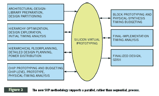SVP (silicon virtual proto-typing) is a creature of the new millennium. Until three years ago, gate delays represented the most significant portion of a signal-propagation time. Therefore, engineers could approximate interconnect delay well enough and could design circuits without paying much attention to place-ment-and-routing issues. A logic designer needed to know little about chip layout, and layout engineers need not have worried about logic design. Logic synthesis automatically adjusted the strength of signal drivers to meet propagation-delay requirements, and designers did not need to worry about the physical characteristics of the conductor carrying the signal. Even the most challenging designs required little knowledge of electronics or physics: Boolean logic was enough.