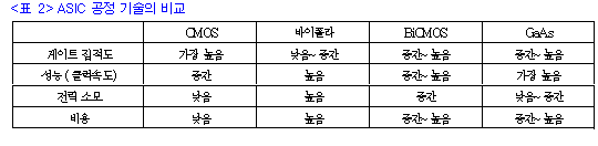 ÁÖ¿ä ASIC °øÁ¤ ±â¼ú¿¡´Â CMOS, ¹ÙÀÌÆú¶ó, BiCMOS, GaAs ±â¼ú µîÀÌ ÀÖÀ¸¸ç, À̵éÀÇ ÀÌ¿ë °¡´ÉÇÑ