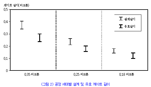 (±×¸² 2)´Â 0.35¹ÌÅ©·Ð, 0.25 ¹ÌÅ©·Ð, 0.18 ¹ÌÅ©·Ð °¢ ¼¼´ëÀÇ °ÔÀÌÆ® ±æÀÌÀÇ ¹üÀ§¸¦ º¸¿©ÁÖ°í ÀÖ´Ù.