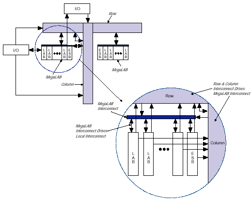 APEX¿¡ ±¸ÇöµÈ MegaLABÀº LAB (Logic Array Block) 16°³¿Í 2KbitÀÇ RAMÀ» ºí·ÏÈÇÑ °ÍÀ¸·Î °¢°¢ÀÇ LAB´Â LE (Logic Element) °¡ 160 °³¿¡ ´ÞÇÑ´Ù. ¾ËÅ×¶ó°¡ LE¶ó°í ºÎ¸£´Â ·ÎÁ÷´ÜÀ§´Â FPGAÀÇ ±âº» ±¸Á¶ÀÎ 4-ÀÎDz LUT (Look up Table) ¿Í Çø³ ÇÃ·Ó (Flip-Flop) À» °áÇÕÇÑ °ÍÀÌ´Ù. (±×¸² 1 ÂüÁ¶) ¾ËÅ×¶ó´Â Flex10K ½Ã¸®Á ºñ·ÔÇØ ÀÚ»çÀÇ FPGA¸¦ ±¸ÇöÇϴµ¥ ÀÖ¾î ÀÌ·¯ÇÑ LE¸¦ ºí·ÏÈÇÑ LAB ±¸Á¶¸¦ äÅÃÇϰí ÀÖ´Ù.