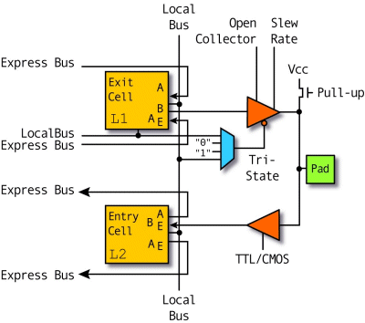 Programmable Interconnect: In Fig 4, a hierarchy of interconnect resources can be seen. There are long lines that can be used to connect critical CLBs that are physically far from each other on the chip without inducing much delay. Theses long lines can also be used as buses within the chip.