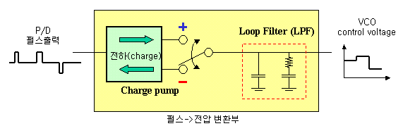 ¨ë Charge Pump (C/P) P/D¿¡¼ ³ª¿Â ÆÞ½ºÆø¿¡ ºñ·ÊÇÏ´Â Àü·ù¸¦ ÆÞ½º ºÎÈ£¿¡ µû¶ó ¹Ð°Å³ª ´ó°ÜÁØ´Ù. ÆÞ½º¸¦ Àü·ù·Î º¯È¯ÇØÁÖ´Â °úÁ¤¿¡¼ Àü·ùÀ̵æ(Icp)°¡ Á¸ÀçÇϰí, ÀÌ ¾çÀº lock timeÀ» ºñ·ÔÇÑ PLLÀÇ ¼º´É¿¡µµ Å« ¿µÇâÀ» ÁØ´Ù. PLL IC¿¡ µû¶ó¼´Â Icp °ªÀ» Á¶Á¤ÇÒ ¼öµµ ÀÖ´Ù.