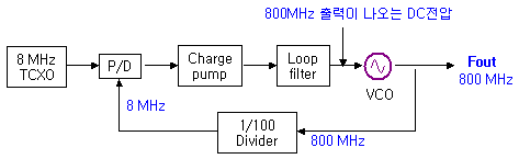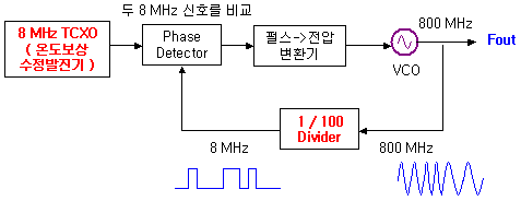 ÀÌ·± ±âÁØÁ֯ļö(reference frequency)·Î ÁÖ·Î ¾Ö¿ëµÇ´Â °ÍÀÌ ¹Ù·Î TCXO (Temperature Compensated X-tal Oscillator : ¿Âµµº¸»ó¼öÁ¤¹ßÁø±â)ÀÔ´Ï´Ù. ¿ÜºÎ ¿Âµµ¿¡ ¿µÇâÀ» °ÅÀÇ ¹ÞÁö ¾ÊÀ¸¸é¼µµ ¿øÇÏ´Â Ãâ·Â Á֯ļö¸¦ ¸Å¿ì ¾ÈÁ¤ÀûÀ¸·Î À¯ÁöÇÒ ¼ö ÀÖ´Â °íǰÁúÀÇ ¹ßÁø±âÀÔ´Ï´Ù. ÀÌ·± TCXO¸¦ ±×´ë·Î 800MHz´ë¿ª¿¡¼ ¾µ ¼ö ÀÖ´Ù¸é ÁÁ°ÚÁö¸¸, ¾Ö¼®ÇϰԵµ ÀÌ·± °í¾ÈÁ¤ ¹ßÁø±â´Â ¼ö½ÊMHz ±îÁö°¡ ÇѰèÀÔ´Ï´Ù. °á±¹ ±×·¡¼ »ý±ä°Ô PLL À̶ó°í º¼ ¼öµµ ÀÖ´Â °ÍÀÌÁö¿ä. ¿©±â¼ µÎ°¡Áö¸¸ Àß Â¤¾îº¸°í ³Ñ¾î°¡¸é ºÐÁÖ±â(divider)ºÎºÐÀÌ ´õ ¸íÈ®È÷ ÀÌÇØ°¥ °ÍÀÔ´Ï´Ù.