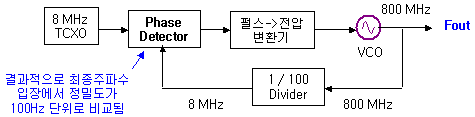 Ãâ·Â¿¡¼ 800MHzÀÇ Ãâ·Â½ÅÈ£°¡ Á¤È®È÷ ³ª¿Ã ¶§, 1/100 ºÐÁֱ⸦ ÀÌ¿ëÇÑ´Ù¸é, P/D¿¡´Â 8MHzÀÇ ½ÅÈ£°¡ ÀÔ·ÂµÉ °ÍÀÔ´Ï´Ù. ±×·¯¹Ç·Î Á¤È®ÇÏ°Ô 8MHzÀÇ ±âÁØÁ֯ļö¿Í ºñ±³¸¦ ÇÏ¸é µÇ¸ç, À̶§ ÇØ´çÁ֯ļöÀÇ ¾ÈÁ¤µµ ³ôÀº ¼öÁ¤¹ßÁø±â¸¦ ÀÌ¿ëÇÏ¸é µË´Ï´Ù.
