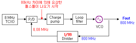 P/D¿¡¼ 80kHz Á֯ļö Â÷ÀÌ¿¡ ÀÇÇÑ ÆÞ½ºµéÀÌ ÁÙÁÙ ³ª¿À¸é °á±¹ charge pump¿¡¼ µé°í³ª¿À´Â Àü·ù·®À» »ì¦ ¹Ù²Ù¾î VCOÀÇ ÀÔ·ÂÀü¾ÐÀÌ ¹Ù²î°Ô µË´Ï´Ù. ±×·¯¹Ç·Î ´ç±Ù VCOÀÇ Ãâ·Â Á֯ļö°¡ ¹Ù²ò´Ï´Ù. ±×·¸´Ù¸é ÀÌ ¹Ù²ï Á֯ļö°¡ divider·Î ´Ù½Ã µé¾î°£´Ù¸é...