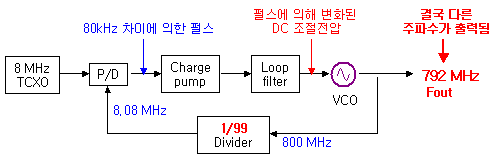 ¿ÀÈ£¶ó - Ãâ·Â¿¡¼ ³ª¿Â 792 MHz°¡ divider¸¦ °ÅÄ¡¸é¼ 99·Î ³ª´µ¸é °á±¹ 8MHzÀÇ Ãâ·ÂÀÌ ³ª¿Í ¹ö¸®°Ô µÇ´Â±º¿ä. ±×·¸´Ù¸é P/D¿¡¼ ´Ù½Ã ¶È°°Àº Á֯ļö¸¦ ºñ±³ÇÏ°Ô µÇ¾î º°´Ù¸¥ ÆÞ½º¸¦ ³»º¸³»Áö ¾Ê°Ô µÇ°í, charge pumpÀÇ »óŸ¦ ±×»óÅ¿¡¼ ¾ÈÁ¤È½ÃÄѹö¸³´Ï´Ù. ±×·¸°Ô µÇ¸é °á±¹ ÀÌ ½Ã½ºÅÛÀº? 792 MHz¶ó´Â ÀüÇô ´Ù¸¥ Á֯ļö¿¡¼ ¾ÈÁ¤ÈµÇ¾î¹ö¸³´Ï´Ù. ¿©±â¼´Â ¿¹´Ï±î ´Ü¼øÇÏ°Ô Ç¥ÇöÇßÁö¸¸.. ½ÇÁ¦·Î Çö´ëÀû À̵¿Åë½Å¿¡¼´Â Àú divider ºÎºÐÀÌ °¡Àå º¹ÀâÇÕ´Ï´Ù. Àý¹¦ÇÑ ºñÀ²º¯È·Î Á֯ļö¸¦ ¹Ù²Ù¾î¾ß Çϱ⠶§¹®¿¡ ´Ù´Ü°è ´ÙÁß°æ·Î·Î Ãâ·ÂÁ֯ļö¸¦ ºÐÁÖÇϸç, ¼ÒÀ§ PLL IC¶ó ºÒ¸®¿ì´Â ³ðµéÀ» ÅëÇØ S/WÀûÀ¸·Î ºÐÁÖºñ¸¦ ¹Ù²Ù¸é¼ ÃÖÁ¾ÀûÀ¸·Î ³ª¿À´Â Ãâ·ÂÁ֯ļö¸¦ ¹Ù²Ü ¼ö ÀÖ°Ô µÇ¾î ÀÖ½À´Ï´Ù.